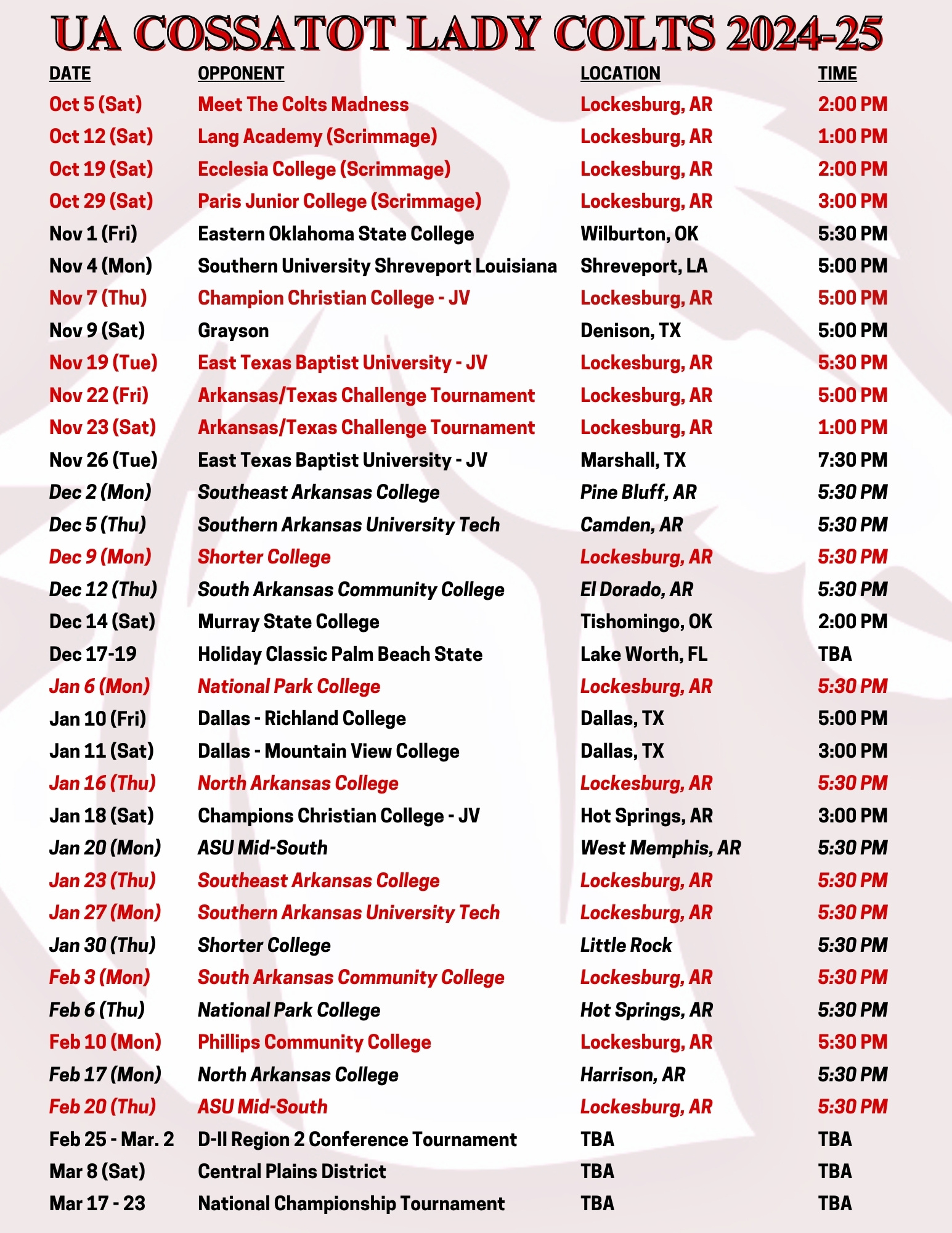 Continue the “Colts” and “Lady Colts” tradition by practicing and competing in the restored, historic 1950s UA Cossatot Bank of Lockesburg Gymnasium in Lockesburg, AR. Under the direction of Coach Stan Asumnu, the men’s and women’s college basketball programs invite you to learn more about how to grow and hone your skills during your time as a student-athlete at UAC! UA Cossatot is a member of the Division II National Junior College Athletic Association (NJCAA).