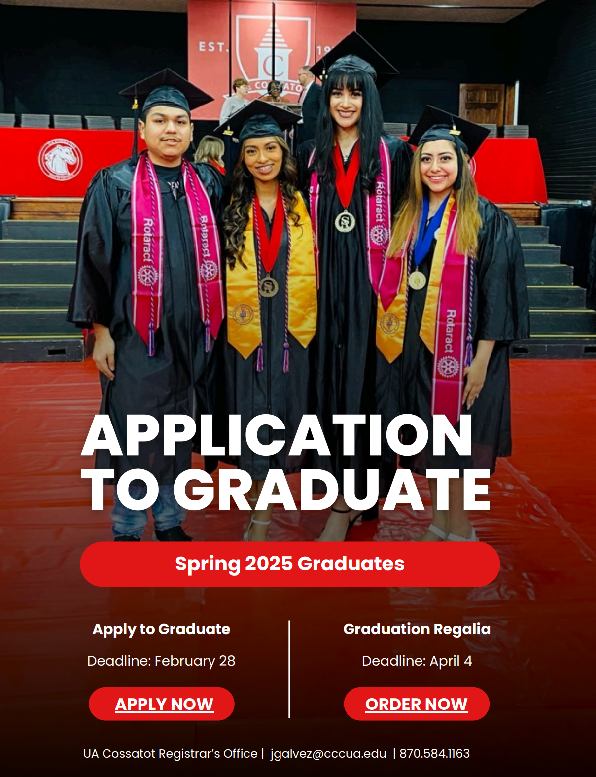 The application to graduate is now open! All students graduating in Fall 2025 must submit an application to graduate by September 30, 2025, and complete the graduation survey by December 12th. The UA Cossatot Fall 2025 Graduation Ceremony will be on December 12, 2025, at the Historic Bank of Lockesburg Gymnasium at 248 E. Main in Lockesburg. Graduation practice will be at 4:00 p.m., with the ceremony scheduled at 5:00 p.m. Please take a moment to complete the application to graduate if you haven't done so already.
